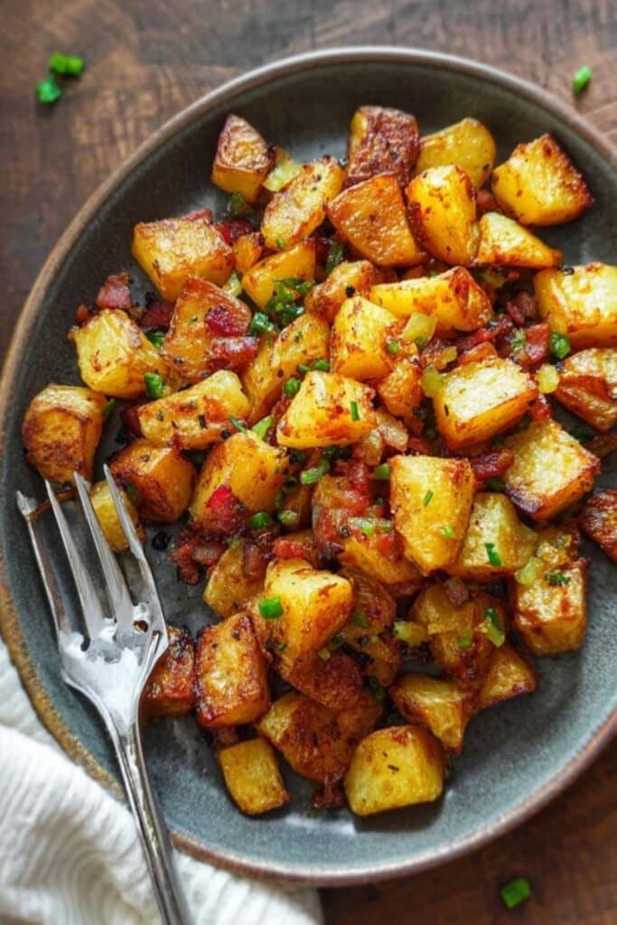 Flip them only when the bottoms are browned, then repeat the process until all sides are crispy. Add diced onions and bell peppers in the last 5–7 minutes of cooking so they get soft and caramelized without burning. A final sprinkle of fresh herbs like chives or parsley adds a pop of brightness.