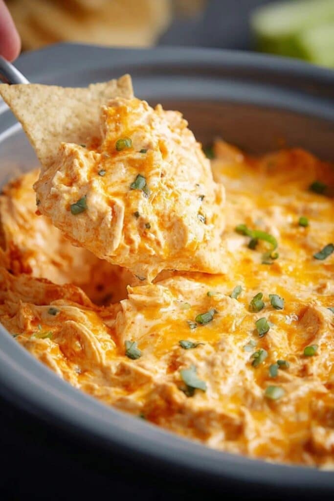 Here’s the magic of Buffalo Chicken Dip in a Crock Pot: it’s foolproof. Add all your ingredients, give it a quick stir, and cover. Cook on low for 2–3 hours or high for 1–1.5 hours. Once everything is melted, stir again to blend, and let it sit on warm mode.