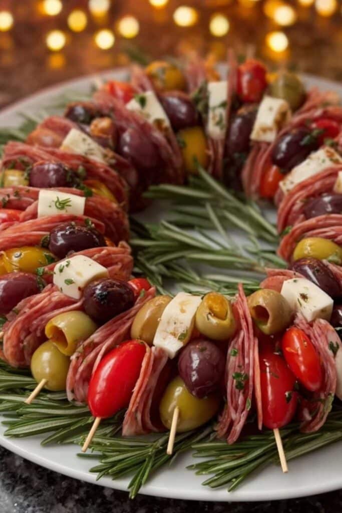 Use a mix of cured meats (salami, prosciutto), cheeses (mozzarella balls, brie), and colorful vegetables (olives, cherry tomatoes, artichokes). Add greenery with rosemary sprigs or baby spinach to give it a real wreath-like appearance.