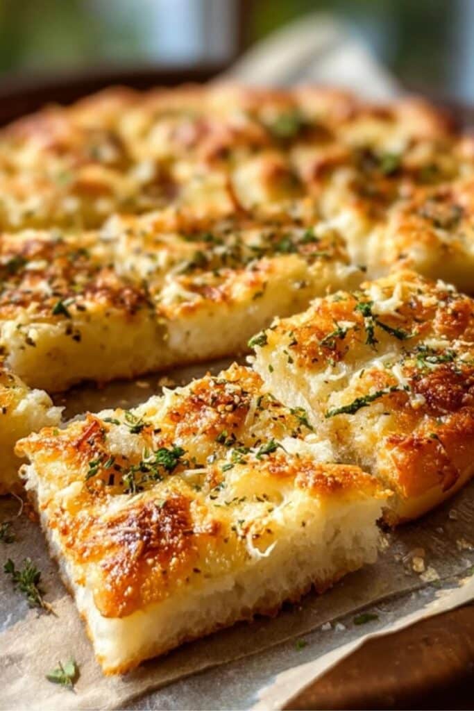 Slice with a serrated knife and serve warm. Your Crispy and Cheesy Garlic Parmesan Focaccia Bread should be audibly crunchy on the outside but pillowy in the middle — the kind of contrast that leaves people reaching for seconds… and thirds.